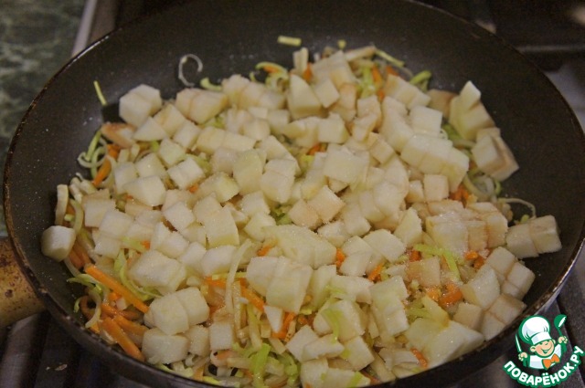 Несколько минут перемешивать содержимое сковороды, пока овощи и яблоко не карамелизуются.
