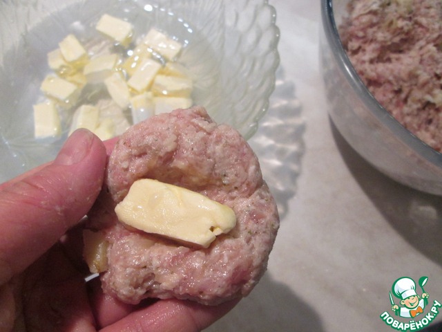 • Нарежьте масло небольшими кусочками и положите в миску с ледяной водой. Разогрейте духовку до 220 градусов. Смочите руки в холодной воде, возьмите столовую ложку фарша, сделайте углубление, положите кусочек масла и скатайте в шарик.