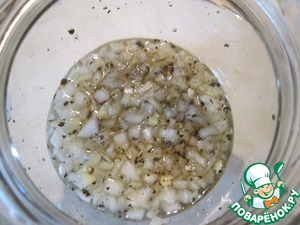 Очистите лук и чеснок и нарежьте как можно мельче. Положите в банку с завинчивающейся крышкой объемом не менее 400 мл., добавьте соль и перец, полейте уксусом. Перемешайте, дайте постоять 30 минут.