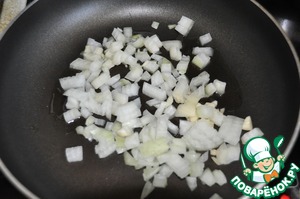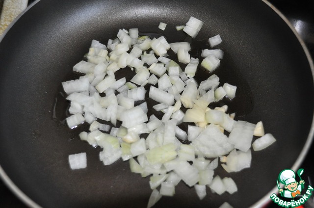 Лук и чеснок режем кубиками и обжариваем до прозрачности на растительном масле. Хотя форма нарезки и размер принципиального значения не имеют, так как всё равно это будет всё измельчаться.