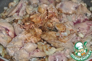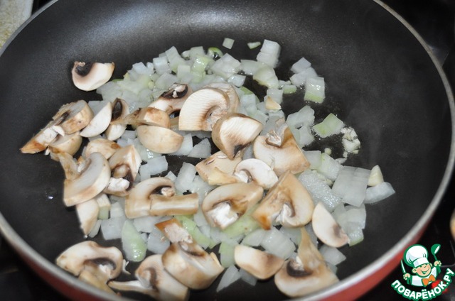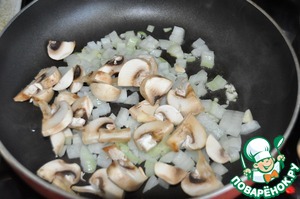 Добавляем нарезанные пластинками шампиньоны и обжариваем всё пару минут.