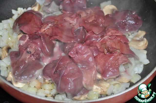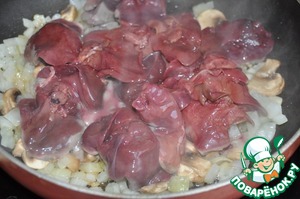 Кладём куриную печень, обжариваем, помешивая.
