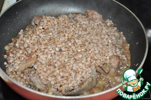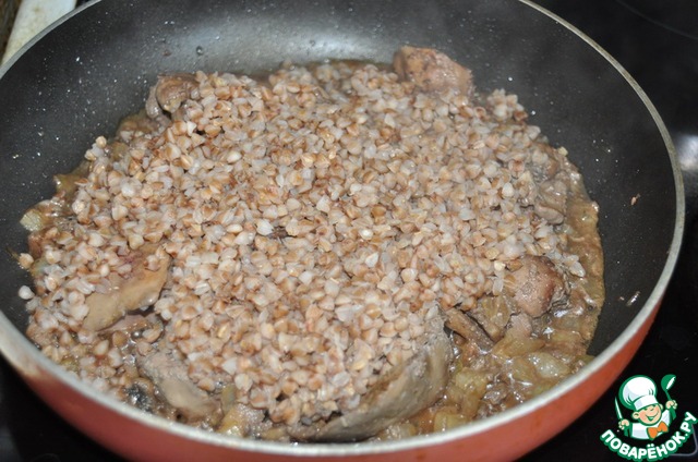 К тушёной печени кладём готовую гречку, перемешиваем, отключаем огонь, даём слегка остыть.