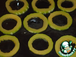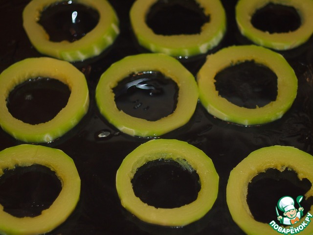 Кабачок очистить от кожицы, нарезать на колечки, вырезать серцевину.