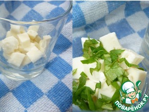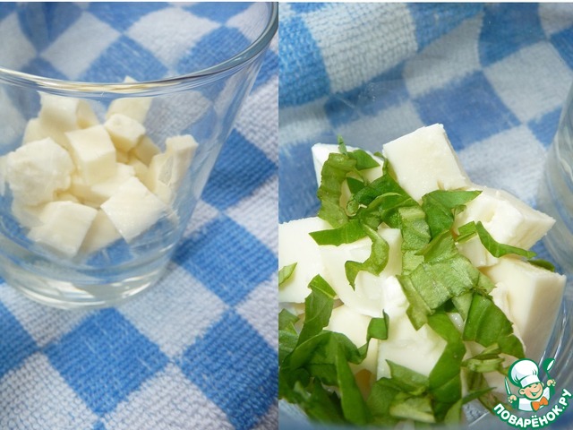 • В порционные бакалы выложить слой моцареллы, нарвать листья базилика.