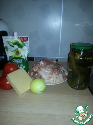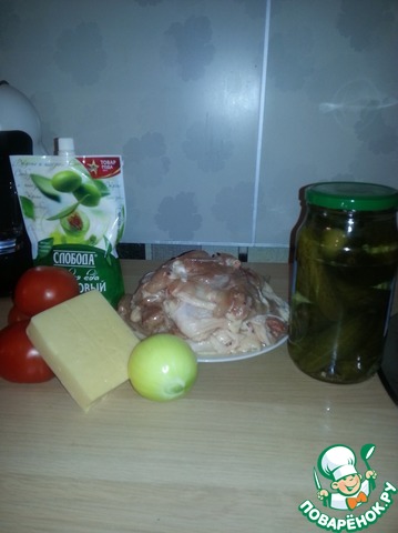 • Нам понадобится: Бедра куриные (отделённые от костей), лук, огурчики маринованные, помидоры, сыр, майонез, соль и перец.