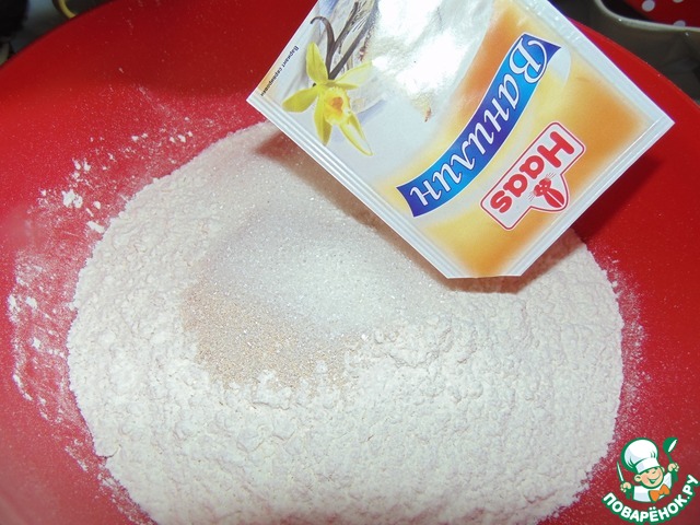Муку просеять, всыпать быстродействующие дрожжи, соль, сахар и щепотку ванилина Хаас.