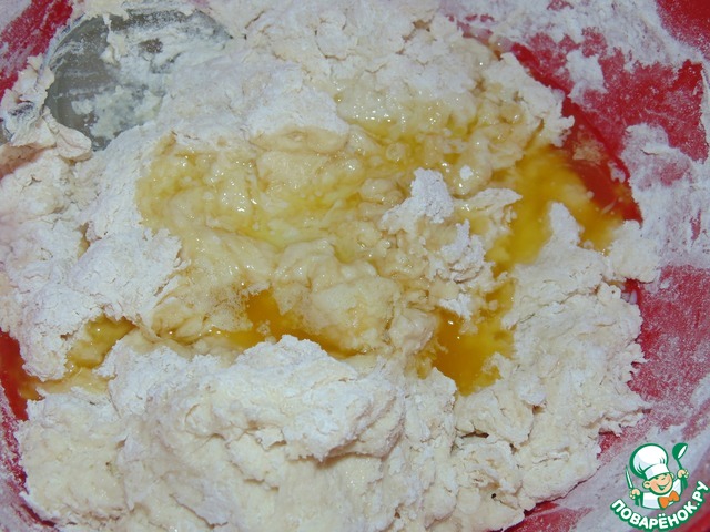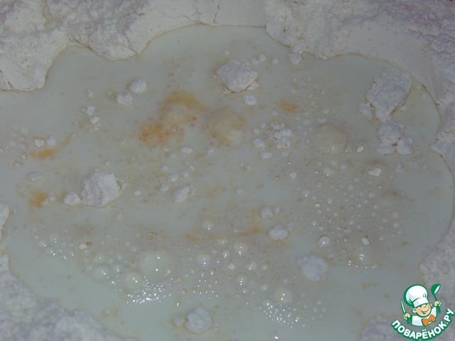 В сухой смеси сделать ямку и влить тёплое (не горячее!!!) молоко и яйцо. Перемешать.
