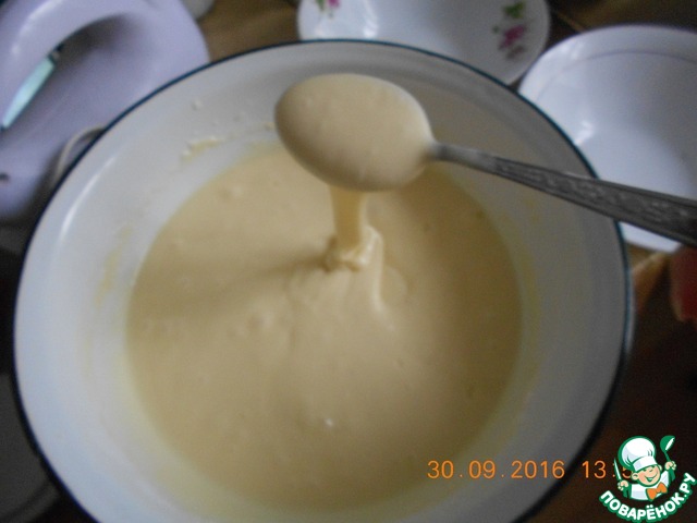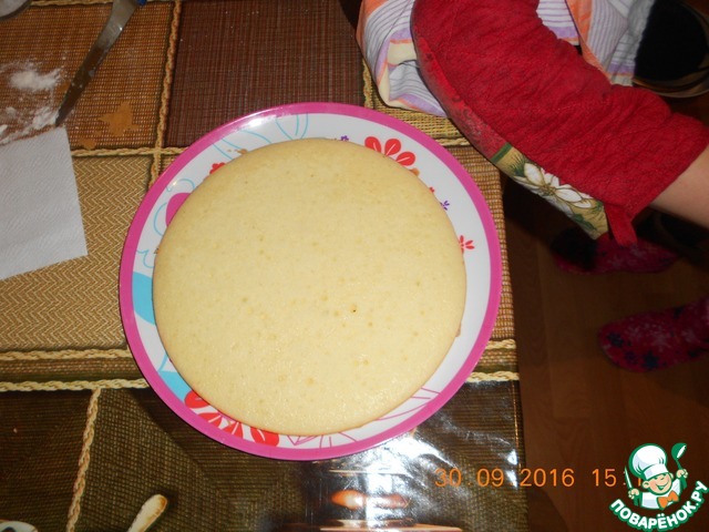 Делим тесто на 4 части и выпекаем в духовке при температуре 180 градусов по 10-15 минут каждый корж, чтобы был не румяный. Получаются невысокие коржи. Тесто мягкое, хрупкое, нужно его осторожно вытаскивать из формы. Но даже если поломается, не страшно) Диаметр формочки 25см, слой теста в жидком виде 1см получается, готовый корж выходит 1,5см.