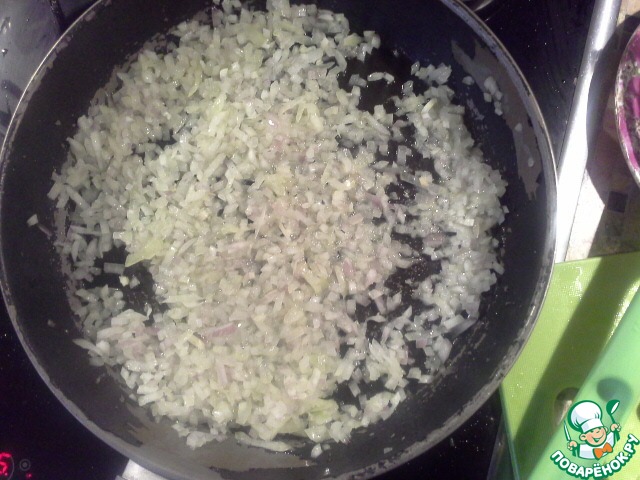Режем лук квадратиками. И жарим его пока не станет прозрачным.