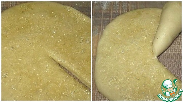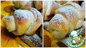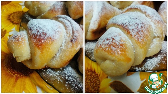 Из теста сформировать шарик величиной с куриное яйцо 2 сорта. Раскатать, смазать растительным маслом, присыпать сахаром (маком или корицей), Сделать надрез от середины до края, приподнять один край и свернуть в конус. Поставить булочки в теплое место на 20 минут. Разогреть духовку до 190 С и выпекать 30 минут.