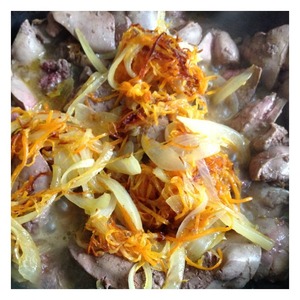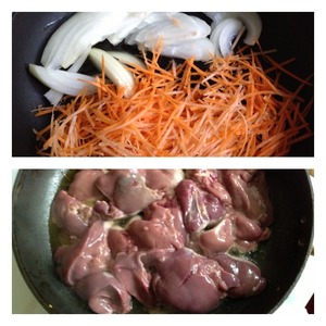Лук нарезать полу кольцами, морковь натереть на терке для корейской моркови. Поставить обжаривать овощи в растительном масле до готовности. Готовые овощи выложить в тарелку. На оставшемся масле ( можно еще добавить) быстро обжарить печенку пару минут на сильном огне.