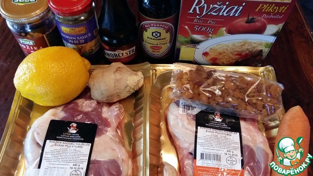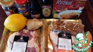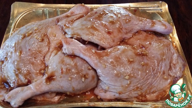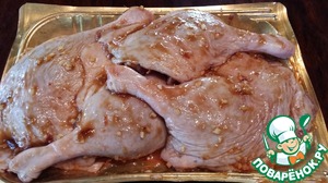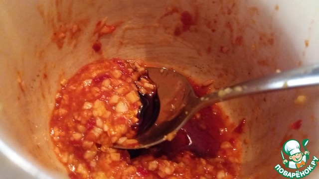 Из вышеуказанных ингредиентов приготовить маринад. Для маринада я использовала сладкий соевый соус от ТМ "Киккоман", а также по 1 чайной ложке вустерского соуса и соуса "Хайсин".
