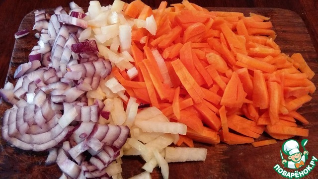 Морковь и репчатый лук мелко нарезать и поочередно обжарить в небольшом количестве растительного масла. Посолить, поперчить и присыпать куркумой.