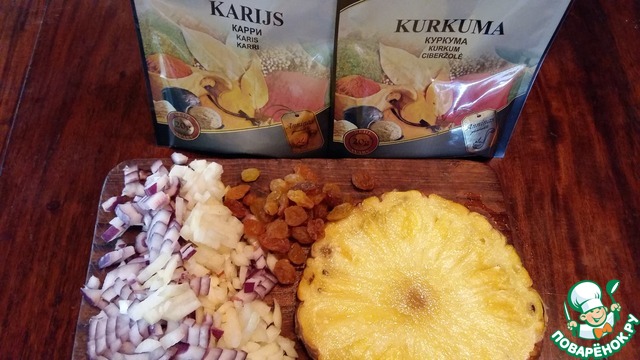 Пока обжаривается морковь почистить и мелко порезать кусочек ананаса. Добавить вместе с изюмом к зажарке и прогреть 1 минуту. Рис я варила в мультиварке в соотношении 1 к 2, программа "рис" - 28 минут. За это время вода полностью выпарилась, а сам рис получился очень рассыпчатым.