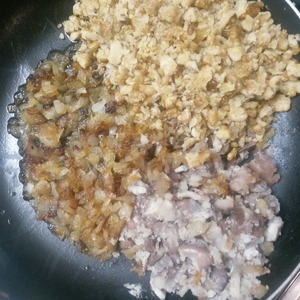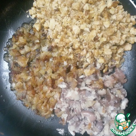 Добавить к луку 2-3 ст. л. отварной фасоли, немного ее размяв, и орехи. Перемешать. Орехово-фасолевая смесь готова.