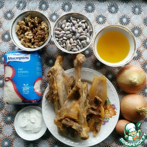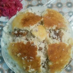Рис готов. Теперь на большое блюдо выкладываем слоями. Сначала выложить весь рис, полить его 7-8 ст. л. топленого масла, теперь выложить нашу фосолево-ореховую смесь, дальше сушеное мясо, и конечно же завершить газмахом, полив его 3-4 ст. л. топленого масла.