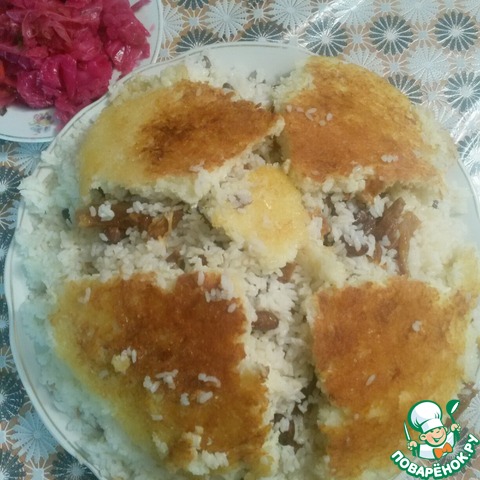 Теперь нужно сделать газмах. На дно казана налить 4-5 ст. л. топленого масла. Из дуршлага переложить в казан 6-10 ст. л. риса ( это зависит от диаметра дна вашего казана) без фасоли, добавить ст. л. сметаны, вбить яйцо и подсалить щепоткой соли. Перемешать, разровнять по дну казана. Дать схватиться газмаху на небольшом огне. Как только масса схватится, выложить на нее кусочки мяса, сверху высыпать рис из дуршлага. Полить 7-8 ст. л. топленого масла. Закрыть крышкой, подложив под нее впитывающую салфетку или полотенце (для впитывания лишней влаги). Выпаривать до готовности риса на минимальном огне (это займет минут30 - 40). Не перемешивать!