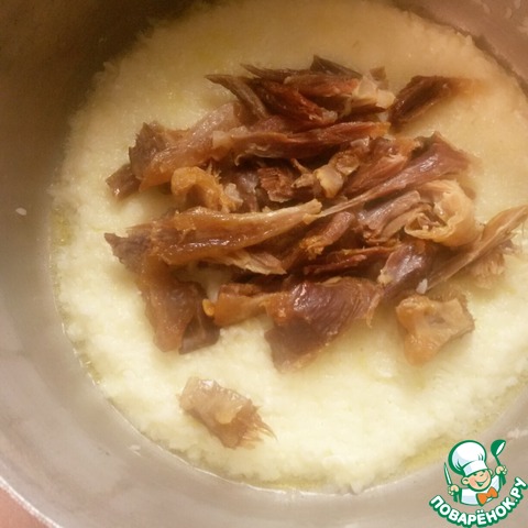 Всыпать в бульон промытый рис и варить его, переодически помешивая до полуготовности. (В промежутках между помешиваниями риса освободить мясо от кости.)