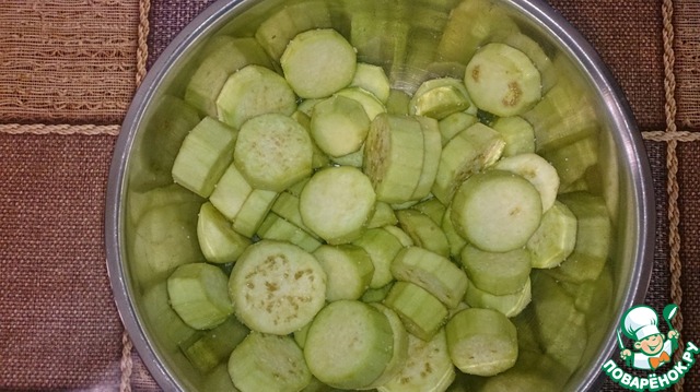 Нарезать кружками толщиной по 1см и обильно посолить. Солите на свой вкус, у меня на 1 кг баклажанов ушло 4 щепотки соли.