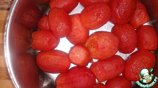 У помидоров обрезать места крепления плодоножек и пробланшировать в кипятке 3-4 минуты. Охладить холодной водой и снять с помидоров кожицу.