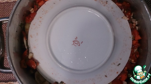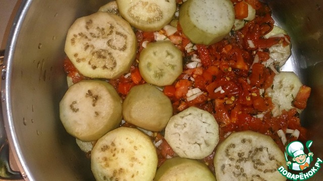 В сухую чистую кастрюлю эмалированную или нержавеющую начинаем слоями укладывать баклажаны, поверх каждого слоя накладываем помидорную заливку. У меня получилось три слоя баклажанов.