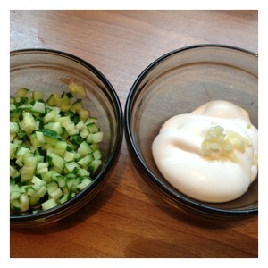 Огурец нарезать кубиком как можно мельче. К майонезу добавить чеснок пропущенный через пресс, перемешать. Собрать салат слоями:
