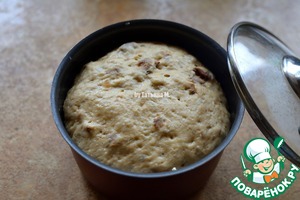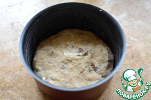 Форму для выпечки (у меня 15 см в диаметре) смазать сливочным маслом, уложить в форму тесто, накрыть крышкой и поставить в теплое место для увеличения в 2 раза;