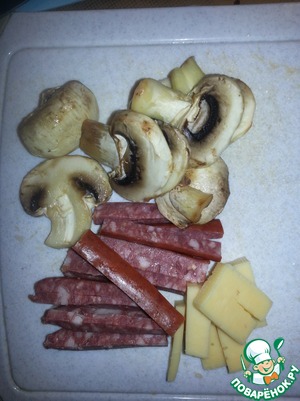 • Нарезаем грибы, сыр и колбаски длинными полосками.