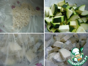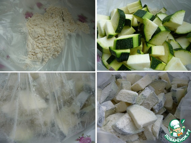 Запанировать цуккини в пшеничной муке. Это удобно сделать с помощью простого пакета: насыпать в пакет муку, добавить в него цуккини и пару раз встряхнуть содержимое пакета.