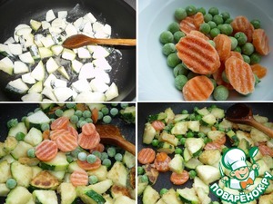 масле до лёгкой золотистой корочки, добавить горошек и морковь, слегка обжарить. Немного присолить. -