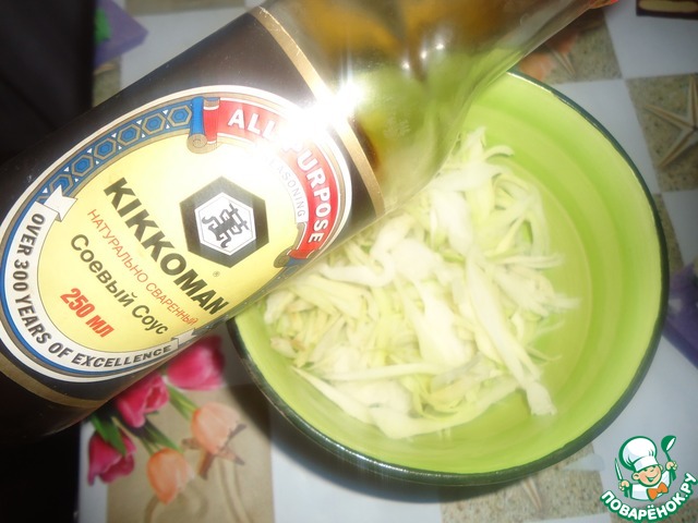 Капусту мелко нашинковать, добавить соус соевый, перемешать.