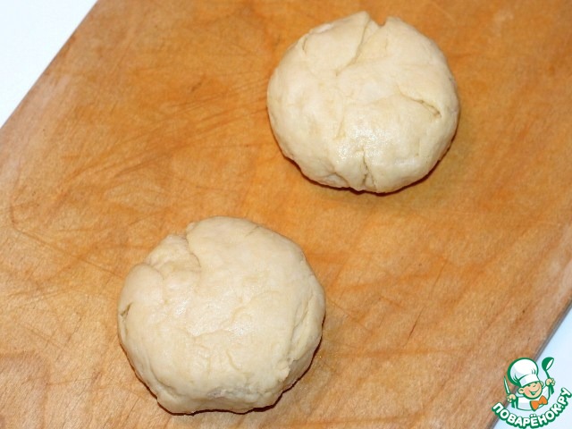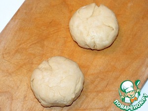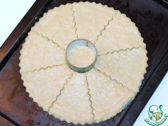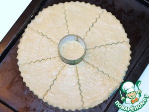 4... и раскатать каждую часть на противне по форме "блин" диаметром 22 см. Обрезать край волнообразной линией при помощи тарелки и ножика для пиццы.