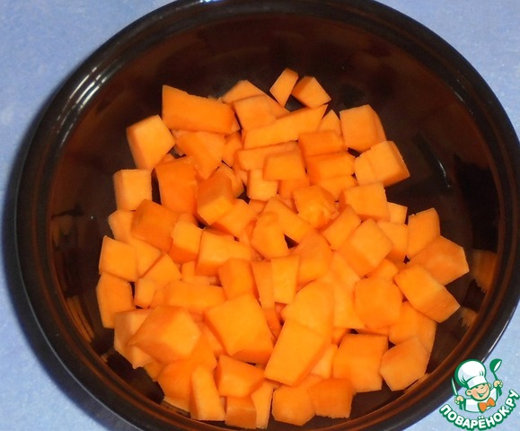 Для начала очищаем тыкву и режем её кубиками.