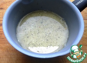 Добавить молотое пшено, хмели-сунели и постепенно влить бульон, помешивая.
