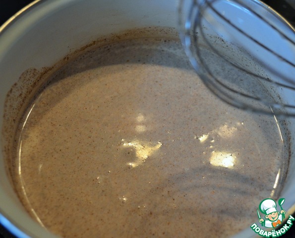 Молочно - коричную смесь процедить и вновь поставить на огонь. При закипании смеси, влить яичную массу, перемешивая деревянной ложкой. Проварить крем на малом огне до загущения. Все время помешивая.