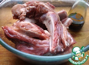 Ребра разделить на порционные куски. Обмазать их смесью соевого соуса, меда и черного перца. Оставить минут на 30.