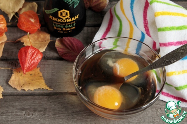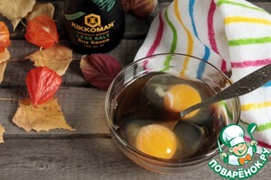 Смешать вилкой яйцо куриное, соевый соус ТМ "Kikkoman" (я использую соус с меньшим содержанием соли) и уксус яблочный.