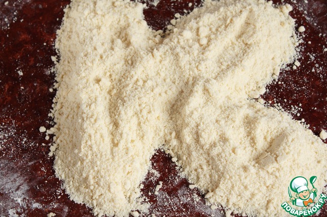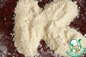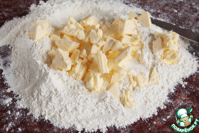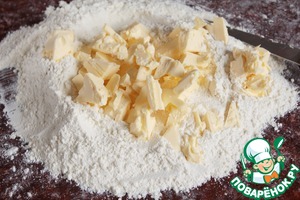 Добавить масло в муку и порубить все вместе ножом в крошку.