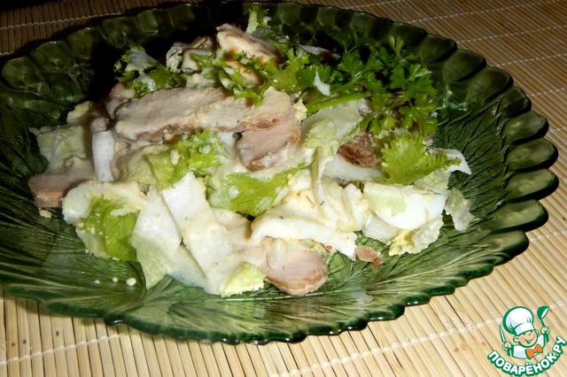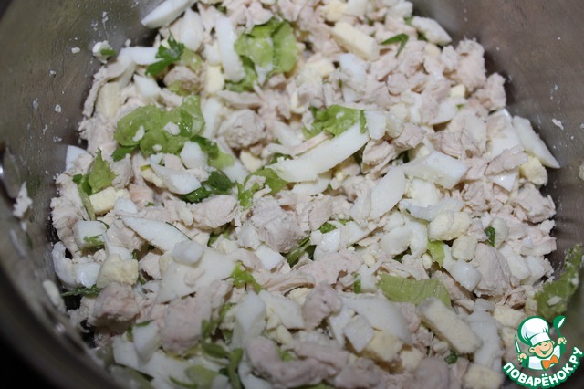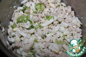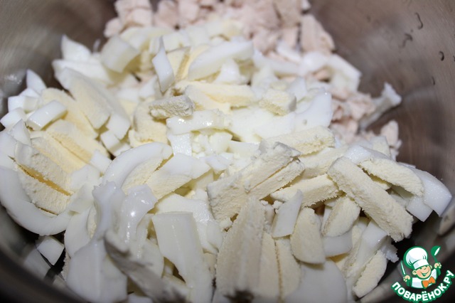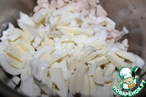 Яйца отварить, почистить и нарезать. Добавить к курице.
