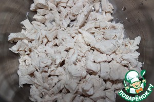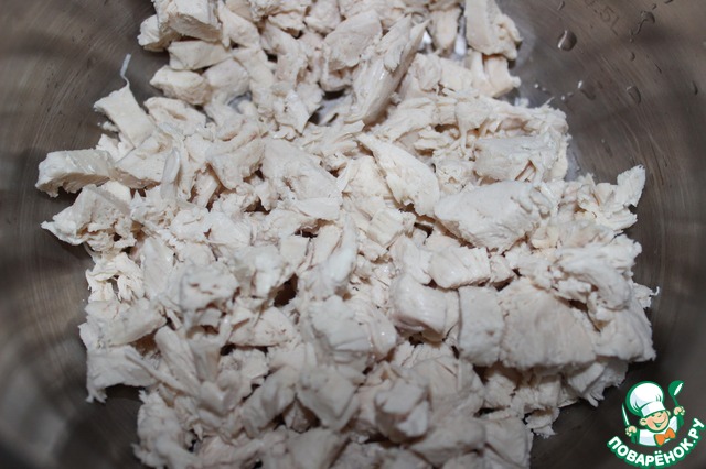 Куриное филе отварить, остудить и порезать небольшими кусочками.
