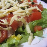 На огурец выложить помидоры, нарезанные кубиками, предварительно удалив у них семена.
