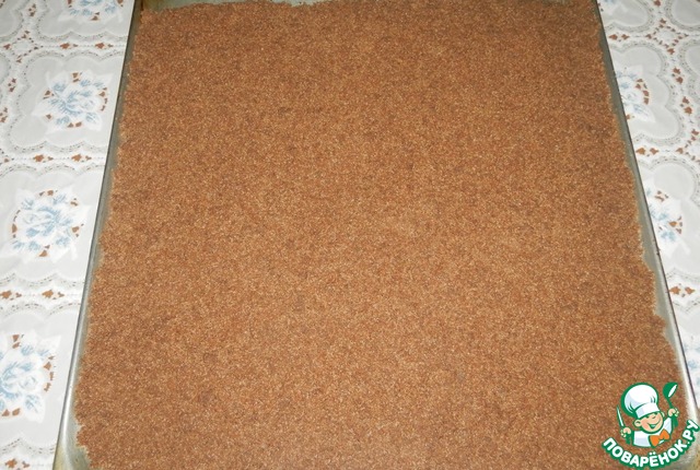 Противень смазать растительным маслом, выложить на него крошку, разровнять и плотненько прижать ладонью. Поставить противень в горячую духовку и выпекать при температуре 180 градусов 20 минут.