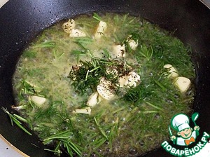 Разогреть в сковороде сливочное масло, добавить все травы, часть рубленого укропа, зубчики чеснока и пассеровать на маленьком огне около 2-3 минут.