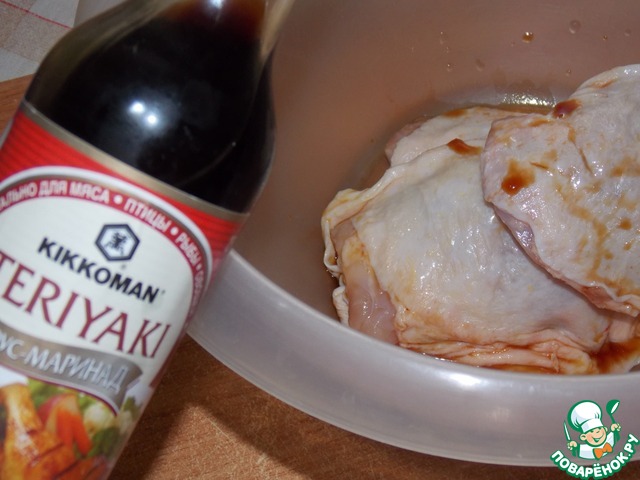 Курицу выложить в миску, добавить 1ст. л. соевого соуса.