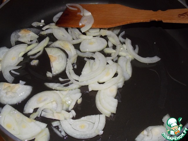 В сковороду налить 2-3ст. л. масла, обжарить лук до золотистого цвета.