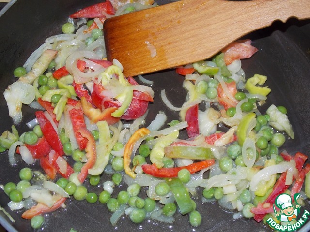 Добавить болгарский перец и горошек, тушить 5 минут.