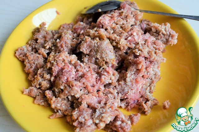 Приготовить фарш. Я измельчаю мякоть баранины ( 480 г.), курдючное сало (80 г.) и крупную луковицу. Пропускаю на мелкой решетке, дважды. Солю и перчу по вкусу.
