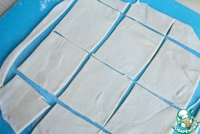 Раскатать тесто в тонкий пласт, нарезать на квадраты, 5 * 5 см..