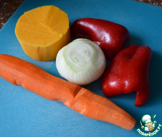 Тыкву и перец также нарезать и добавить к овощам. Обжарить пару минут.